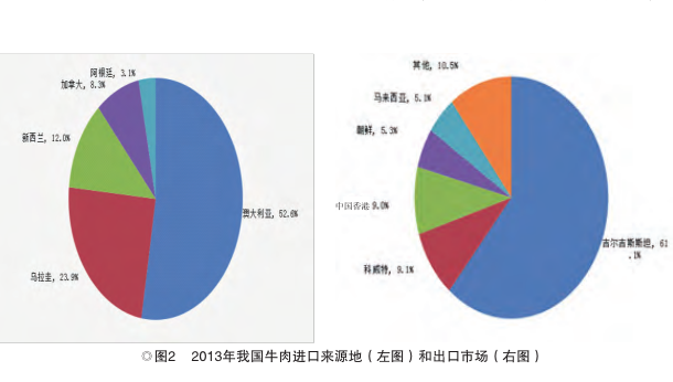 从贸易流向来看,我国牛肉进口来源地比较集中,2013年自澳大利亚进口15.5万吨,占我国牛肉进口总量的52.6%,其次为乌拉圭和新西兰,分别占23.9%和12%,三者合计约占我国牛肉进口总量的90%左右;牛肉出口市场主要为亚洲国家和地区,2013年对吉尔吉斯斯坦出口牛肉3588吨,占我国牛肉出口总量的61.1%,其次为科威特、中国香港、朝鲜和马来西亚,分别占9.1%、9%、5.3%和5.1%(图2)。