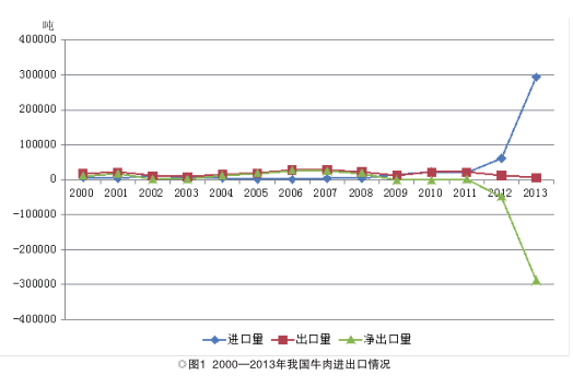 近年来,随着人口持续增长和人均收入提高,居民对牛肉需求不断增长,国内牛肉产不足需,牛肉进口激增,我国从牛肉净出口国转变为净进口国。从历年牛肉进出口数据来看,2000年我国牛肉净出口1.1万吨,2009年转变为净进口866吨,2013年净进口增至28.8万吨(图1)。