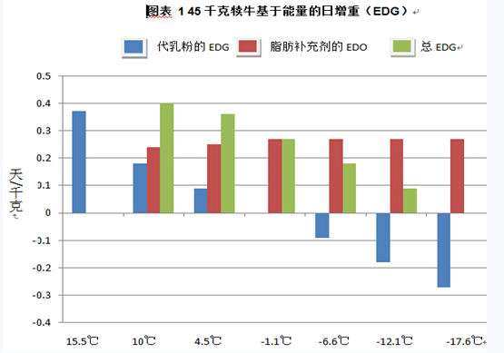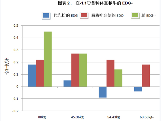 在-1.1℃状况下,代乳品和脂肪补充剂的共同能量作用仅仅维持EDG的水平。对于-1.1℃下54.5千克(图2)的犊牛而言,单独的代乳粉将降低EDG,而63.5千克的犊牛不会增加EDG,这与0.11千克的脂肪补充剂作用相同。