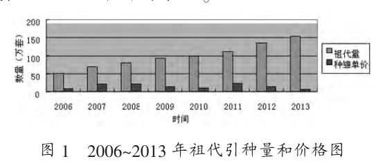 祖代种鸡场在利润和市场的双重促进下,第一是祖代投资比父母代相对引种费大一点,但市场风险相对比较平稳;第二是父母代客户的规模逐渐扩大,要求祖代厂家进一步扩大规模以满足单批次数量多的引种;第三是一条龙企业在做自己的祖代,以达到整个产业链的衍生,回顾近10年祖代场家的发展,速度非常快,目前有16家祖代场家,年祖代种鸡引种量从2006年49.49万套增至2013年155万套,已经连续实现7年增长(见图1),直接导致父母代种鸡产出增加,市场供大于求,价格跌倒最低谷,笔者认为排除疾病的情况下,年引种量在100万套就已满足市场需求了。