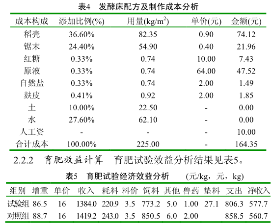 该场发酵床的垫料的配方以重量为基础进行计算,垫料层深度为90cm,由表1可知,每平方米面积垫料的重量为275kg。需要说明是在计算垫料原料用量时按实测2.5kg/m2的垫料层密度进行计算,项目所调查的养殖场垫料层厚度为90cm,但因初次制作时填满的垫料池会因为原料自身的重量有较大幅度的下沉,导致实际深度不足90cm,一般下降幅度在20cm左右,所以第一次做床时垫料的实际高度在110cm。经计算发酵床的制作成本为164.35元/m2,单位平方米深度上单位造价为1.83元/cm,每年补料2次,每次补20~30cm,按25cm计算,年每平方米发酵床补料的成本为45.75元。发酵床的使用寿命一般按5年计算,则每平方米每年的成本为78.62元。育肥猪饲养周期按本试验125d计算,年可育肥出栏2.9批,按每头猪占用1m2发酵床面积计算,育肥出栏1头猪,发酵床的成本为27.1元。