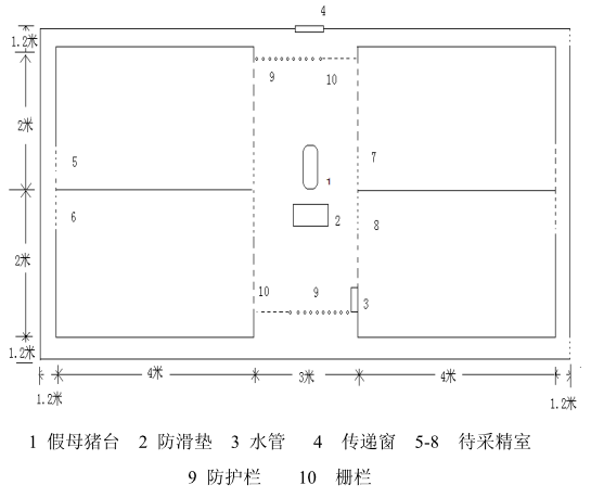 2.2采精时先分别把4头待采公猪赶入待采精室(也可把后备公猪放入待采室观看,用于训练后备公猪),最后把一头性欲旺盛的公猪引入采精室。采精时,采精人员敲打假母猪台发出声响并发出“上、上、上”的急促口令,诱使公猪爬跨假母猪台,然后开始采精,这时待采室的4头公猪通过栅栏可受到视觉、听觉、嗅觉的强烈刺激,会在舍内不安而啃咬栅栏,口吐唾液,发出声响并来回走动等现象,等采精室内采完一头公猪并赶走后,再放入一头被调起欲望最强的待采公猪进入采精室,公猪会很快爬跨假母猪台并采精成功。辅助人员此时可以把另一头公猪赶进待采精室以节省时间。
