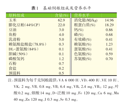 本试验采用单因子试验设计,将96头平均体重为(5.87±0.25)kg的(21±1)日龄断奶杜×长×大三元杂交仔猪随机分为4个处理组,每个处理6个重复,每个重复4头猪(公、母各半)。对照组饲喂基础饲粮,苯甲酸组在基础饲粮中添加0.5%苯甲酸,柠檬酸组在基础饲粮中添加0.5%柠檬酸,复合酸组在基础饲粮中添加0.25%苯甲酸和0.25%柠檬酸。基础饲粮组成和营养水平见表1。试验全期28d,试验期间动物饲养于保育床内,自由采食和饮水,并按照猪场常规程序进行管理和消毒。
