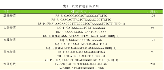 使用OmegaBioTek公司提供的E.Z.N.A.TMstoolDNAextractedkit试剂盒提取盲肠食糜中微生物的DNA。扩增总细菌、大肠杆菌、乳酸菌、双歧杆菌和芽孢杆菌的引物和探针序列参照Fierer等[6]和Qi等[7]设计,引物和探针的序列见表2。使用IQ5real-timePCRdetectionSystem(Bio-Rad,CA,USA)进行定量RT-PCR扩增。具体的反应体系和扩增程序如前期研究所描述[7]