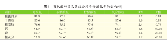 2.2有机酸种类及其组合对养分消化率的影响(见表4)