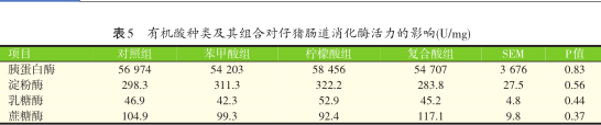 2.3有机酸种类及其组合对仔猪肠道消化酶活力的影响(见表5)