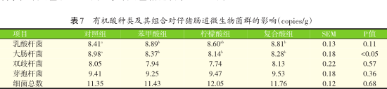 2.5有机酸种类及其组合对仔猪肠道微生物菌群的影响(见表7)