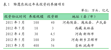 雏鹰农牧:2014年11月29日,雏鹰农牧公告,公司与郑州盛源生态农业科技有限公司签订股权转让协议,拟将郑州雏鹰蔬菜种植有限公司100%的股权以1200万元的价格转让给盛源农业。而就在此公告发布前3天,雏鹰农牧对吉林子公司增资1.5亿元。据了解,雏鹰农牧吉林子公司投产之后,雏鹰农牧的生猪产能将由目前的360万头提高到760万头。雏鹰农牧近年来投资的养猪项目见表1、图1。