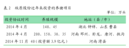 牧原股份:2014年4月份,牧原股份在河南唐河、扶沟和山东曹县设立子公司,而这三家子公司的注册金额均为5000万元。11月29日,牧原股份公告,牧原股份杞县、通许、正阳3家子公司成立,注册资金均为2000万元,经营范围为饲料加工等。在前一周,牧原股份与滑县达成合作协议。根据协议,牧原股份投资3.9亿元,将建年出栏规模为40万头的生猪项目。另外,牧原股份在邓州、卧龙、唐河、扶沟分别建设了年出栏规模为200万头、150万头、30万头、35万头的生猪养殖基地;在湖北钟祥、山东曹县建设年出栏规模为140万头和45万头的生猪养殖基地。如果扩张项目全部达产,牧原股份的产能将超过600万头。至此,牧原股份也开始利用资本优势,走上养猪扩张的道路。牧原股份近年来投资的养猪项目见表2、图2。