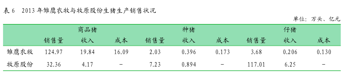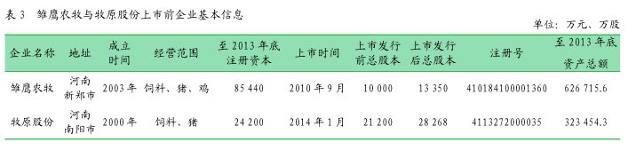 雏鹰农牧:雏鹰农牧集团股份有限公司发端于1988年,经过20多年发展,已拥有十余家分(子)公司,员工数超过3000人。2010年9月在深圳证券交易所成功挂牌上市,被誉为“中国养猪第一股”。上市以前,雏鹰农牧的养猪区域仅限于河南省的局部地区,但上市后利用资本市场雄厚的资本优势,不断扩张养猪版图,先后在吉林、内蒙古和西藏等地区投资大型养猪项目。牧原股份:牧原股份始建于1992年,历经22年的发展,现拥有10个全资子公司和1个参股公司(河南龙大牧原肉食品有限公司),建立了集科研、饲料加工、生猪育种、种猪扩繁、商品猪饲养为一体的完整封闭式生猪产业链。