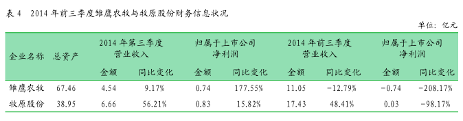 2014年1月初,雏鹰农牧公开发行面值不超过8亿元的公司债券;在2014年8月份从市场上通过非定向增发的方式,再次融资15亿元。2014年1月牧原股份成功上市,按照其招股说明书,牧原股份发行6050万股,募集资金6.67亿元,为牧原股份的扩张解决了资金问题。观点:在无重大事件或负面消息的影响下,双方都借助资本市场,在生产投入和扩张方面应该都不差钱。