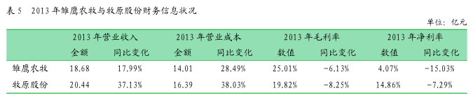 3.原料供应与产品营销模式。雏鹰农牧销售渠道多元化,牧原股份销售渠道相对集中。2013年雏鹰农牧销售前五位客户销售额共计占总销售额的22.67%;2013年牧原股份销售前五位客户销售额共计占总销售额的34.14%;说明在产品营销上牧原股份更为集中,且其第一大客户为河南龙大食品,牧原拥有龙大食品40%的股份,营收的稳定性方面可能优于雏鹰农牧(见图3、图4)。