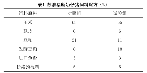 试验日粮采用苏淮猪断奶仔猪专用配合饲料,试验组日粮配方和对照组相同,用10%发酵豆粕代替其中的普通豆粕,其余成分保持不变。苏淮猪断奶仔猪饲料配方见表1。