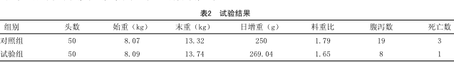从表2试验结果来看,对照组平均日增重250g,试验组平均日增重269.04g,试验组比对照组提高了7.6%;对照组料重比1.79∶1,试验组料重比1.65∶1,试验组比对照组下降了7.8%,经统计分析,两者均差异显著(P<0.05)。