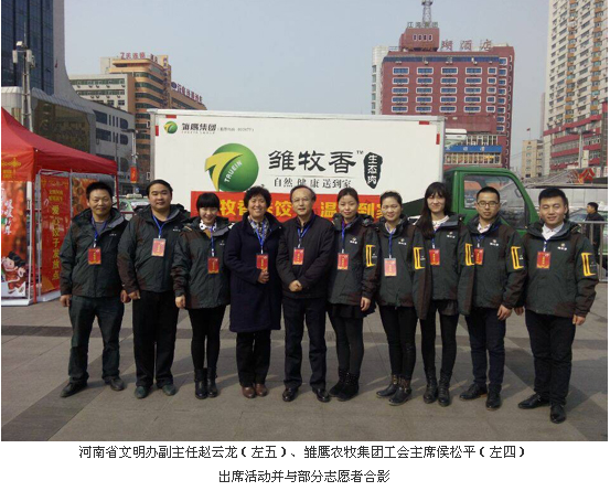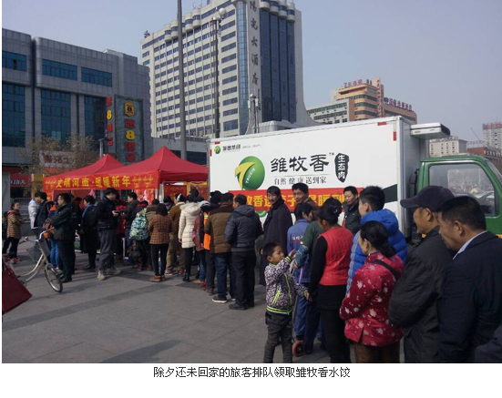 饺子是春节北方每个家庭不可缺少的除夕主食,年三十吃饺子是中国人传统的饮食习惯,而不少外乡人、环卫工、的哥等为了生活忙碌,或没得来及赶上回家团圆、或为了城市的建设在除夕当天依然辛勤劳动。为了让他们感受到中原大地的爱与关怀,感受到家一般的热情和温暖,雏鹰农牧集团当天以郑州市火车中心站为主会场,从上午11时开始,由志愿者向来往旅客送出5000余份热气腾腾的雏牧香水饺。