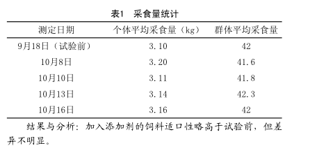 对参试牛的个体采食量和群体采食量进行了统计,结果详见表1。