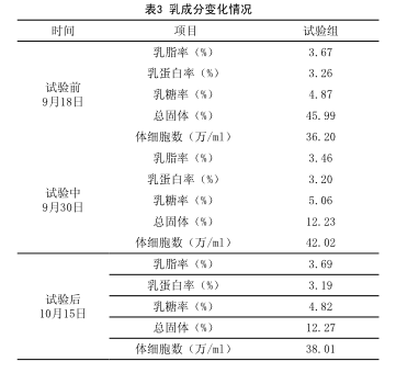 试验期间共做3次DHI测定,根据反馈的数据显示,两组的平均乳脂肪、乳蛋白率、乳糖率、总固体、体细胞均差异不显著。