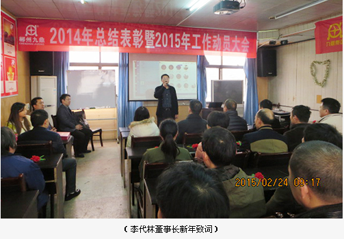 会上,首先由李董为大家作新年致词,李董讲到2014年养殖行情持续低迷对于饲料行业来说是一个难熬之年,但郴州九鼎仍出现产销二旺的局面,是全体员工努力的结果,2015年市场将持续低迷,也许会更难熬,产品是根,密集化是本,用非常之能做非常之事方能立于不败之地,以此极大的鼓舞了全体员工的士气。