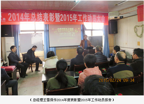 随后,由总经理王雪保作2014年度总结暨2015年度的工作动员报告,王总对郴州九鼎2014年的经营情况做了总结回顾,对各部门取得的成绩加以肯定,特别是2014年大后勤线的主要重点工作抓项目,15个项目小组共计为公司节约了费用692733元,此成功是可喜可贺的。同时也对郴州九鼎的未来5年饲料板块进行了描述,并确定郴州九鼎2015年的活动主题为“欢庆十五年,共踏十亿路”,而主要三个动作则为:密集占位战役、系统服务战役、基地建设战役,并对三大战略如何贯彻实施作了详细布署。