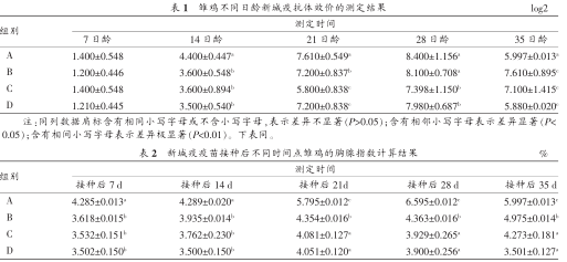 分别于7、14、21、28、35日龄,每组各随机抽取5只雏鸡,无菌翅下静脉采血1mL,分离血清。采用微量血凝抑制试验(HI)测定新城疫抗体效价。