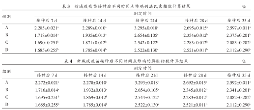 在免疫后的第7、14、21、28和35天,每组各取5只,编号并称量其体重,然后处死,迅速取其免疫器官胸腺、脾脏、法氏囊称重,计算免疫器官指数。法氏囊指数=(法氏囊重量/雏鸡体重)×100%,胸腺指数=(胸腺重量/雏鸡体重)×100%,脾脏指数=(脾脏重量/雏鸡体重)×100%。