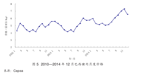 巴西猪肉价格先下跌后上涨。猪肉价格从2013年10月份6.01雷亚尔/kg震荡下跌到2014年5月5.05雷亚尔/kg后连续6个月上涨,11月份价格为7.27雷亚尔/kg,创2012年以来历史新高,12月份环比下跌10.2%,为6.53雷亚尔/kg,同比上涨14.3%(图5)。