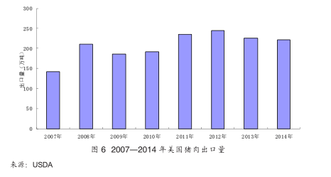 美国猪肉产量增加,价格预期将下跌。根据美国农业部的最新预测,2015年美国猪肉产量和人均消费量均预期增加,猪肉产量预计较上年增4.6%,为238.95亿磅,人均猪肉消费量预计增1.3%,由上年46.5磅增至47.1磅。受产量增幅明显影响,2015年生猪价格预计在60~65美元/英担之间,较2014年均价76.03美元/英担小幅下跌。由于俄罗斯依然对进口美国猪肉实施禁令,而中国当前国内市场已经趋于饱和,未来美国猪肉出口量预计难以显著增加,同时国内需求趋稳,国内市场价格将较为稳定。
