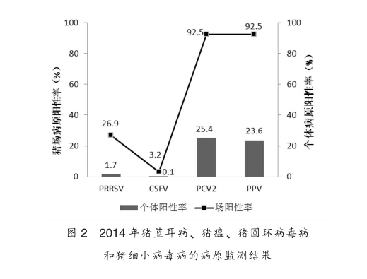 2014年PRRS血清学监测结果显示,未免疫场的PRRSV抗体个体阳性率在70%以上,免疫场的PRRSV抗体个体阳性率在90%以上,免疫场与未免疫场的PRRSV抗体阳性率均在90%以上。