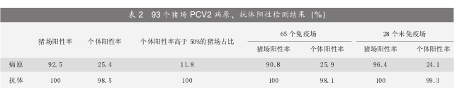 2014年对28个省(直辖市、自治区)的93个猪场进行PCV2病原检测,结果显示:PCV2感染普遍;免疫PCV2疫苗猪场与未免疫PCV2疫苗猪场的PCV2病原阳性率无显著差异;93个猪场的PCV2抗体阳性率为100%,疫苗免疫猪场和未免疫猪场的PCV2抗体水平没有显著差异(表2)。
