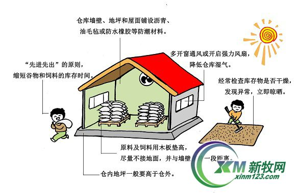 据悉,猪场防霉除了改善饲料的储存条件(见图),最普遍的做法是添加脱霉剂。揭阳市裕丰猪场采用自配料,其场长蒋永来告诉农财宝典新牧网记者,裕丰猪场使用的脱霉剂有两种不同类型,一种是无机类,如蒙脱石,具有吸附霉菌毒素的作用;另一种是有机酸或有机酸盐,如山梨酸钾,具有杀灭霉菌的作用。如果配料后随即喂猪,添加蒙脱石即可;如果料配出来还要储存一段时间,建议添加蒙脱石与三梨酸钾脱霉剂,先把霉菌杀灭。中国农业科学院饲料研究所副研究院武书庚博士认为,无机类脱霉剂对黄曲霉毒素的吸附作用较好,而对其它毒素的吸附一般,不过目前也有所改善。