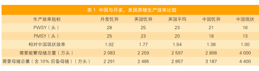 供求关系改变市场竞争格局市场竞争的关键是降低养猪成本生产效率在很大程度上决定着养猪成本。如果猪只生长缓慢,出栏时间延长,则生产成本增加;抵抗力下降,疫病增多,则治疗成本增加;母猪生产性能不佳,使用年限短,年提供断奶仔猪数(PSY)少,则母猪培育成本和分摊成本增加;养猪设备机械化、自动化程度不够,则人工成本增加。正是由于生产效率低,养猪成本高,我国养猪行业的经济效益远远低于欧美发达国家。因此,提高生产效率是降低养猪成本的关键。以PSY的改进为例,目前,我国能繁母猪的PSY平均只有16头左右,而美国平均在23头以上,丹麦等国甚至已超过28头,差距之大可见一斑(表1)。如果我国达到与欧美国家同样的生产效率,则需要的能繁母猪数至少减少1/3,将节约大量的饲料、土地、水等资源,其经济效益和社会效益显而易见。