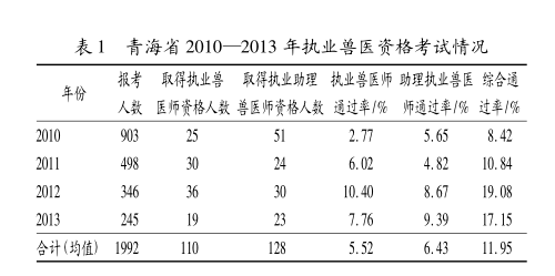 2010—2013年全省取得执业兽医师资格和执业助理兽医师资格的人数分别为:25人和51人,30人和24人,36人和30人,19人和23人。可以看出2010—2013年青海省考试通过率持续保持较低水平。但执业兽医师和助理执业兽医师通过率分别从2010年的2.77%和5.65%逐年上升至2013的7.76%和9.39%,综合通过率也从8.42%上升到了17.15%,说明青海省兽医行业从业人员专业素质不高,临床实践经验缺乏的现状。但同时也反映出执业兽医资格考试正发挥着正面作用,兽医队伍的专业素质正在缓步提升。这也是执业兽医资格考试评价和提升兽医从业人员执业所必需的专业知识、技能水平和职业道德的初衷所在。