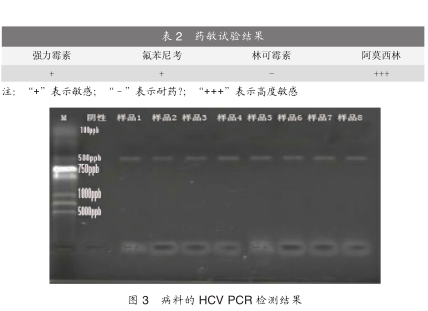 取透明菌落均匀涂抹于鲜血平板上,取强力霉素、氟苯尼考、林可霉素、阿莫西林药敏片于平板上37.5℃培养24小时,结果如表2。由表2可以看出,阿莫西林最敏感。