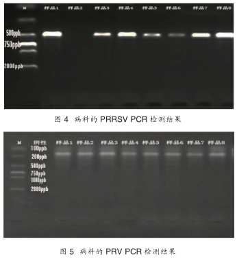 取8头疑似感染猪瘟、高致病性猪蓝耳病和伪狂犬病而死亡的猪只的肺脏、脾脏、淋巴结,将每头病死猪的三种组织病料剪碎、研磨、混匀,共生成8份样品,进行猪瘟病毒(HCV)、高致病性猪蓝耳病病毒(PRRSV)和伪狂犬病毒(PRV)的PCR检测。PCR扩增产物经琼脂糖凝胶电泳,紫外灯下观察结果。