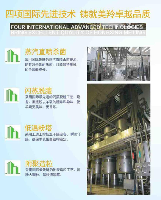 通过对羊乳营养成分的全面分析和科学研究,研发出一套针对羊乳制品的专业加工技术。以100%纯鲜山羊奶为原料,采用具有国际先进水平的四大关键工艺“蒸汽直喷杀菌、闪蒸脱膻、低温粉塔、附聚造粒”,确保了产品品质安全可靠,奶粉速溶可口。