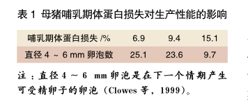 已有研究表明,如果母猪哺乳期体蛋白损失达到10%~12%,断奶后发情间隔将会延长,下一胎的分娩率和产仔数也会受到影响(见表1)。因此,尽管短期营养摄入不足不影响母猪哺乳量,但会引起生殖激素系统慢性变化,甚至会减少下一胎排卵率和胚胎存活率。