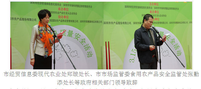 深圳市康达尔集团股份有限公司、深圳市农产品股份有限公司、深圳市光明集团等35家市农业龙头企业参与了此次活动,部分市人大代表,市政协代表以及市民代表应邀参加了此次活动。深圳市经贸信息委现代农业处处长郑璇女士、深圳市市场监管委食用农产品安全监管处处长张勤添先生等市领导纷纷致辞,倡导企业保障食品安全,践行诚信诺言。