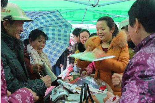 早上八点南桥广场,人力行政部和综合服务部的同志们冒着大雨将喷绘、横幅、展架等宣传资料放好,带着满满一盒宜昌九鼎通讯、产品手册和九鼎笔来到九鼎饲料展台前,还未来的及坐下,就被早早等候的村民们团团围住了,九鼎饲料吧,给我一份,我要一份,看着村民们一双双渴望的眼睛,一张张期待的双手,行政部美女王经理笑容满面的将资料为大家一一双手奉上,不到一个小时,带来的资料都全部发放完毕。
