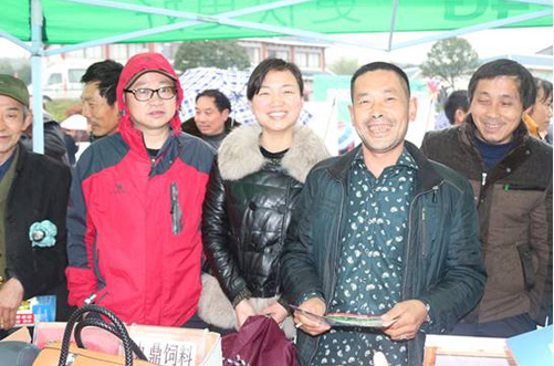 面对后来赶过来的村民的资询,综合服务部的同志们就地临时展开了口头讲解和培训,恰巧小编碰到了一个自称一直用我们九鼎饲料的村民,灵机一动,现场来了一段现场采访。交谈中得知他是家住南桥村五组的村民胡世奎大哥,虽然家里喂得猪不多,但一直是用九鼎饲料;问起他使用九鼎饲料的效果如何,他说用九鼎饲料猪涨势快,,还跟小编认真算起了帐:“去年下半年抓了九头小猪,回来后共用了75包九鼎饲料,四个月差3天就全部出栏了,都是200多斤重,将猪送到当地屠宰场,屠宰场的人都说肉质也蛮好的,而且我们都还没什么技术不很懂养猪的,所以你们九鼎饲料确实可以!我以后还会一直用!”胡大哥情真意切的说。简直就是帮九鼎做活广告了,但这广告却是我们的用户发自内心的。