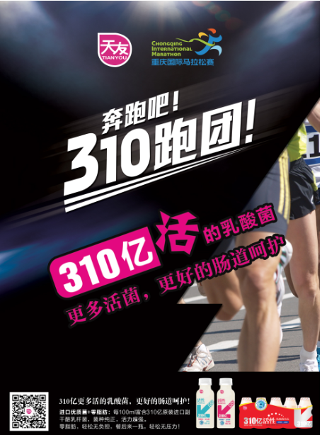 天友乳业作为2015年重庆国际马拉松比赛独家乳制品赞助商,旗下的310亿活性乳酸菌饮品更是本次活动的指定乳制品,为了山城人能够更加健康快乐的生活,除了在乳制品上坚持品质,还创立了“天友310跑团”,呼吁大家一起跑起来。