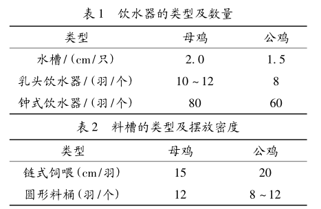 在育成期内充足的饮水和料桶的摆放密度也是提高整齐度的重要因素,在限制饲喂中,应在喂料前1h开始供水直至料吃完后1h,下午供水1次,时间为1h。饮水器和料槽的数量见表1和表2为宜,采用乳头饮水器不限制饮水。