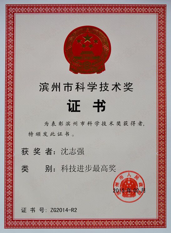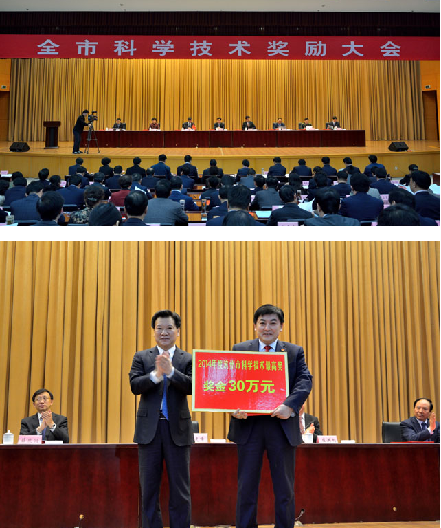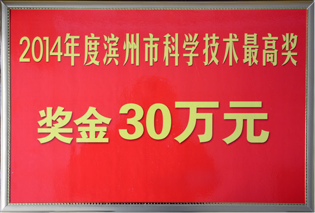市委书记、市人大常委会主任张光锋亲自为我公司董事长沈志强研究员颁发“滨州市科学技术最高奖”证书和30万元奖金,对沈院长获奖表示祝贺!
