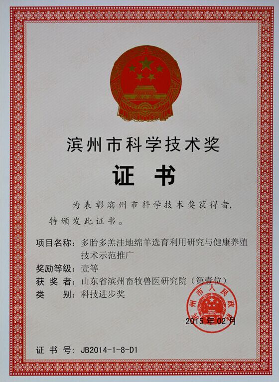 李维东副市长宣读了《滨州市人民政府关于2014年度滨州市科学技术奖励的决定》、《滨州市人民政府关于2014年度滨州市专利奖励的决定》。我公司董事长沈志强研究员荣获滨州市科学技术最高奖,同时,他主持的“多胎多羔洼地绵羊选育利用研究与健康养殖技术示范推广”获得滨州市科学技术进步奖一等奖,我院林初文副研究员主持的“小型动物实验人工气候室及控制方法”获得滨州市专利奖二等奖,参与的“冷库温度自动控制系统”获滨州市科技进步二等奖等。充分展现了我院科技创新工作取得的新成就。
