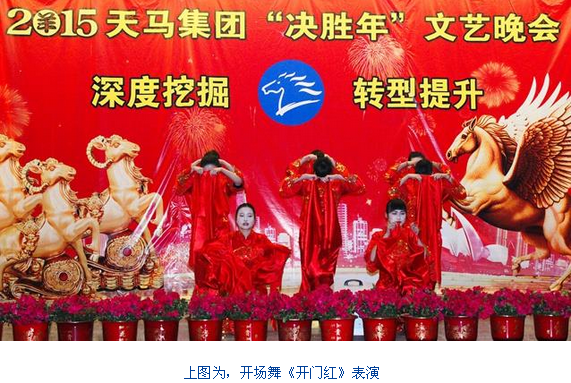 “开门红呀, 红四方,欢欢幸福扑打着我们的胸膛;开门红呀,大风光.....”3月12日晚,在喜庆、激情四射的《开门红》的舞蹈中,以“深度挖掘 转型提升”为主题的天马集团2015年文艺晚会在集团员工俱乐部华丽上演。晚会上,应邀出席的嘉宾们和广大员工及其家属,欢聚一堂,一起分享天马集团2014年的辉煌,共同见证天马集团的2015精彩开年。晚会现场精彩才艺轮番上演,掌声不断,热闹非凡,让每个到场的天马人和嘉宾不由地为天马自导自演的文艺晚会由衷点赞。