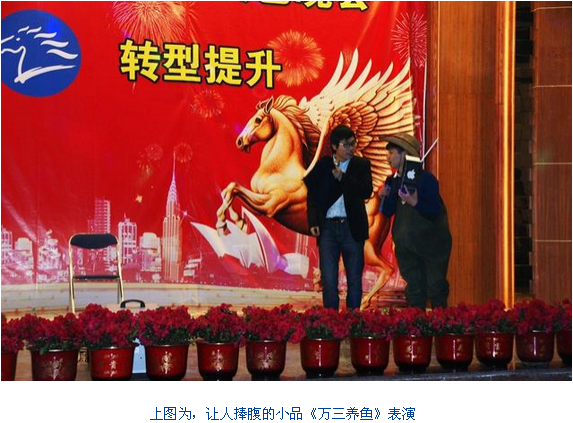 晚会开场的《开门红》舞蹈舞出了天马2015年伊始业绩便红红火火的喜庆;福建事业部的帅哥们一曲雄浑豪迈的《众人划桨开大船》,唱出了天马事业成功的精髓和高歌猛进的气势,赢得了全场热烈的掌声和欢呼声;天马集团工会、党支部带来的热辣舞蹈《It's me》张扬着青春美少女的活力,一度将晚会推向高潮;浙江事业部表演的小品《岁月》,让人忍不住一起怀念天马奋斗的峥嵘岁月,为天马未来的宏伟蓝图而激动,引起全场天马人心底“职业、事业、家业在天马”的共鸣;天马著名笑星黄永灯和财务中心新锐“演员”吴娜、林宗地带来的《万三养鱼》,接地气又夸张的造型、爆笑的对白、趣味盎然的情节让现场观众捧腹笑cry;期间,穿着花裙的三只可爱机灵的超级萌狗现身表演握手、站立、钻圈、跨栏、列队走等精彩《萌萌哒》绝技,“萌翻”全场;采购中心、行政中心、营销服务中心、生产中心、审计部共同带来的舞蹈串烧,让在场的观众真切的感受到了劲爆的舞蹈饕餮大餐,惹得全场沸腾;集团董监高领导层和莅临的嘉宾共同带来的歌曲《爱拼才会赢》和贯穿整场晚会的大奖更是让全场气氛达到顶点,让场中观众不管是“金掌”、“银掌”还是“仙人掌”都拍得不亦乐乎。