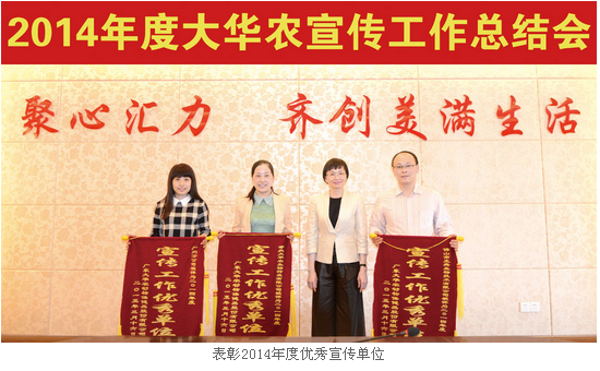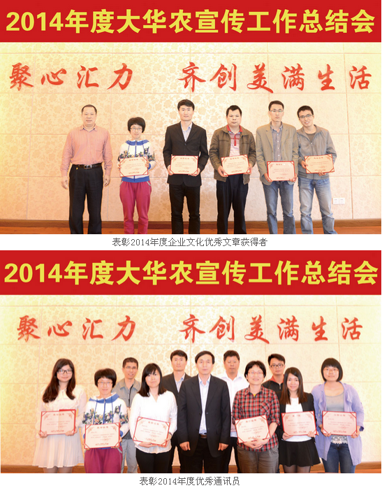 会议听取了《大华农2014年度宣传工作总结及2015年工作重点》报告。2014年,大华农宣传工作紧紧围绕公司年度工作主线,充分利用内刊、网站、微信等宣传平台,真实、及时报道公司经营发展动态,努力挖掘企业文化典型,宣传企业文化;帮助广大干部员工正确理解公司决策层的决策思路和意图,向公司领导反映基层单位的生产动向,营造了良好的企业文化氛围。2015年,大华农宣传工作将不断丰富宣传手段,提高宣传实效,着力做好企业文化宣传,报道先进典型,激发创业热情,传递正能量,同时做好对外宣传平台建设以及内部通讯员队伍的组建,集中力量营造健康向上的企业氛围,助力生产经营。