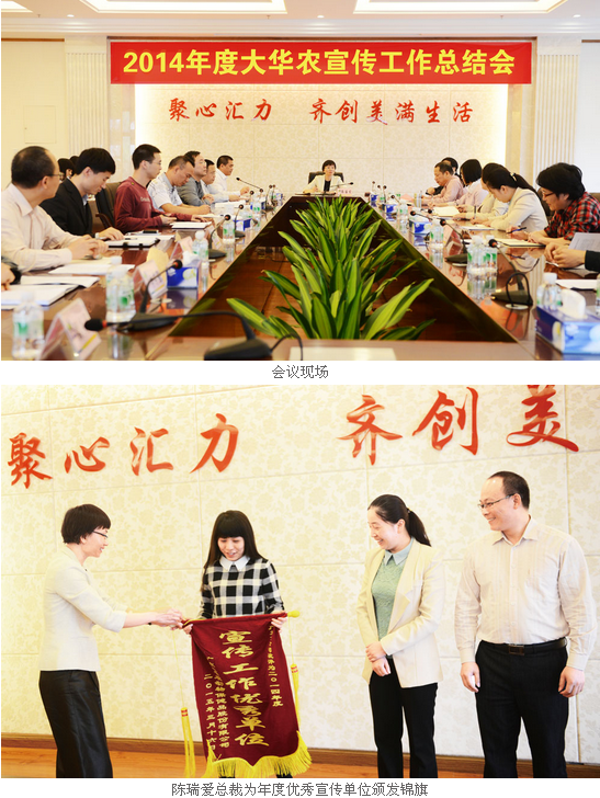 陈瑞爱总裁对2014年度公司宣传工作给予充分肯定,指出宣传工作既是推动企业发展的需要,也是连接干部员工与团队的重要纽带。她认为,2014年大华农宣传工作取得了极大进步和良好的效果,及时、准确、全面的宣传,提升了公司在行业、政府以及社会中的知名度和影响力;全面传递了公司决策层、管理层的经营思路以及对思路的贯彻执行情况,为公司发展营造了积极向上的舆论氛围;深入宣贯企业文化,提升公司团队凝聚力,发挥宣传正能量;内刊征文等活动增强了干部员工的学习兴趣,提升了整体的文化内涵和知识水平;内刊增刊缩短了出版时间,提升了内容可读性和文稿质量,更好地发挥了宣传职能;正确处理好宣传与公告的关系,更好地发挥了宣传对企业发展的引领作用。
