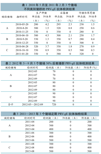 1.1.3 实验动物。黑龙江省3个规模化养猪场(A、B、C)的种猪群,这3个养猪场在2009年5~6月期间进行了猪伪狂犬病gE基因缺失弱毒疫苗免疫。