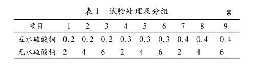 试验过程参考半微量凯氏定氮法[3],选用苜蓿、玉米、豆粕3种饲料,由于是无水硫酸钠与五水硫酸铜2个因素,设定每个因素为3个水平,每种饲料分为9个处理,每个处理设3个重复(见表1)。每个处理分别添加不同量的五水硫酸铜和无水硫酸钠,通过消化蒸馏观察现象,并得出数据。其他试剂添加量及试验过程均相同,试验过程中准确记录试验现象及结果,并统计数据。试验处理及分组,见表1。