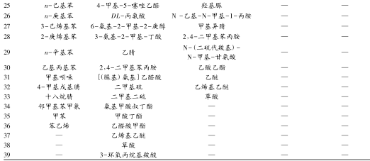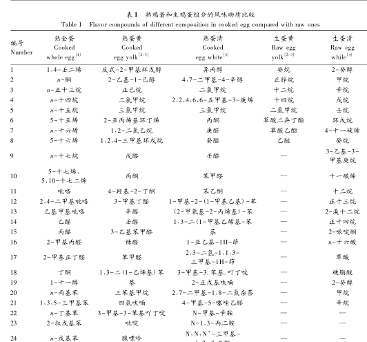 生鲜鸡蛋仅有蛋腥味,其挥发性风味物质主要包括吡啶、吡嗪、吡咯、噻唑等含氮杂环化合物、醛类和茚满类等[1-4]。热加工后,呈味物质的数量、种类都远高于鲜鸡蛋。学者分别从熟化后的全蛋、蛋黄和蛋清中分离鉴定出了36、39和33种风味物质,而生鸡蛋蛋黄和蛋清中仅检测出8和18种[3](表1)。熟鸡蛋的香味主要来自烷基芳香族、腈类和酮类[2]等挥发性物质,其前体物质主要有:脂肪酸、氨基酸、色素、羟基酸(合成烯萜类物质)、单糖和糖苷。醛类气味阈值较低,对风味贡献大,主要由缬氨酸的施特雷克尔降解(Streckerdegradation)和脂肪酸的氧化产生;芳香族化合物多具有香味,主要由葡萄糖或类胡萝卜素的热降解产生[1,5]。由糖类和脂肪产生的羰基化合物,通过与氨基酸或蛋白质发生美拉德反应(Maillardre-action)产生杂环化合物:吡嗪类、吡咯类、噻吩类、噻唑、呋喃、萜类和具有鸡蛋特征气味的硫化物(以及硫胺素的降解)。